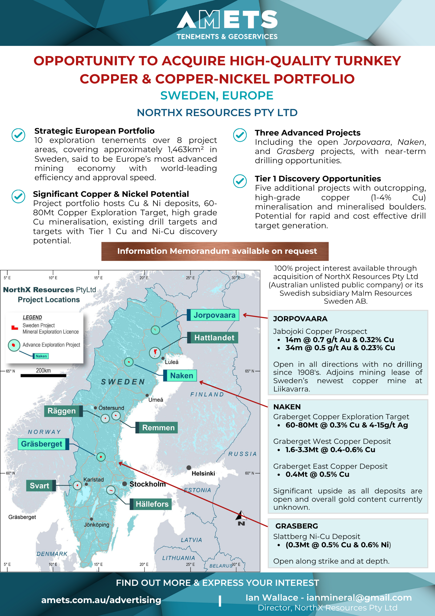 NorthX Resources Pty Ltd are seeking expressions of interest in relation to its high-quality turnkey Copper & Copper-Nickel Portfolio located in Sweden, Europe.