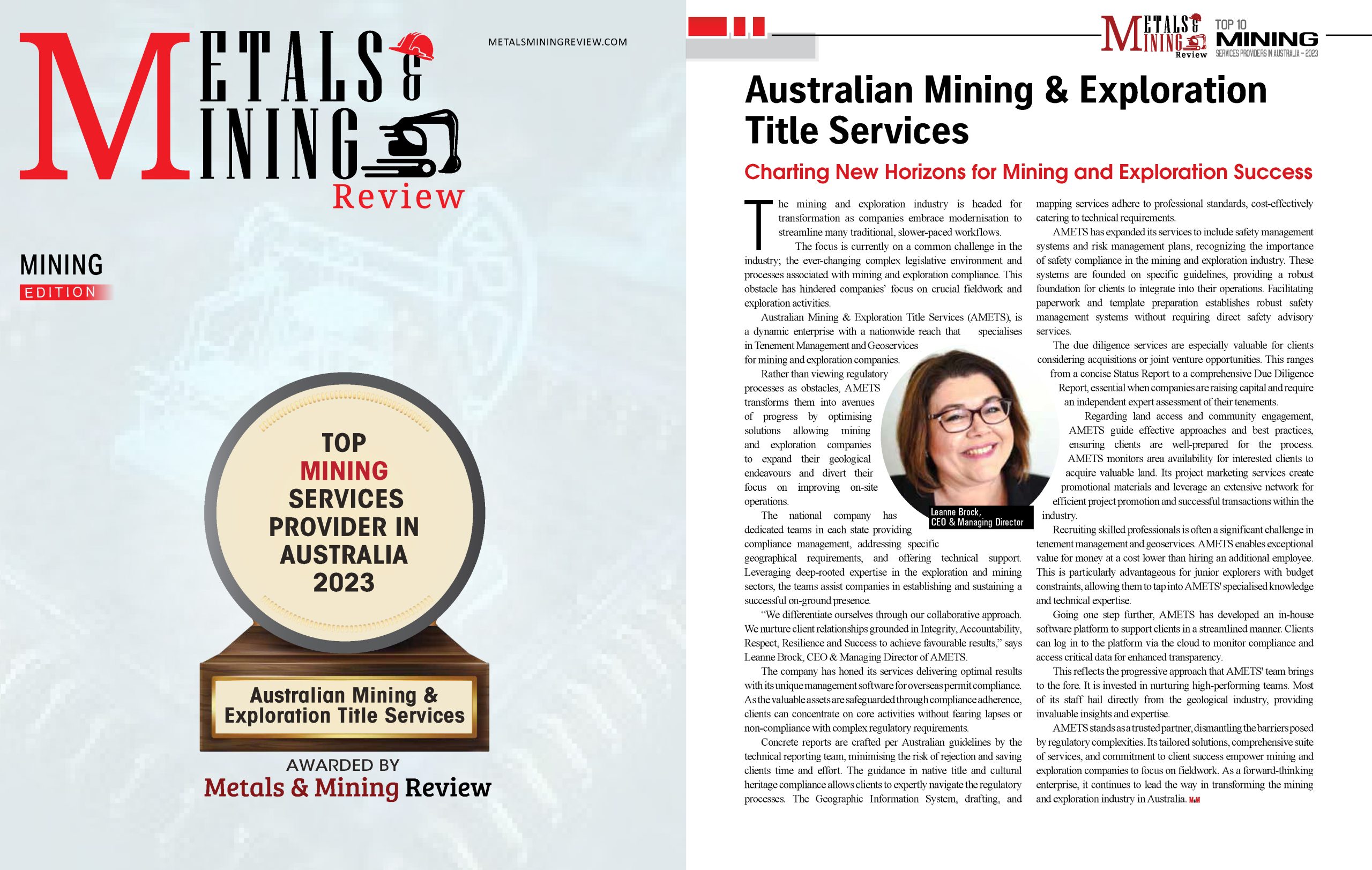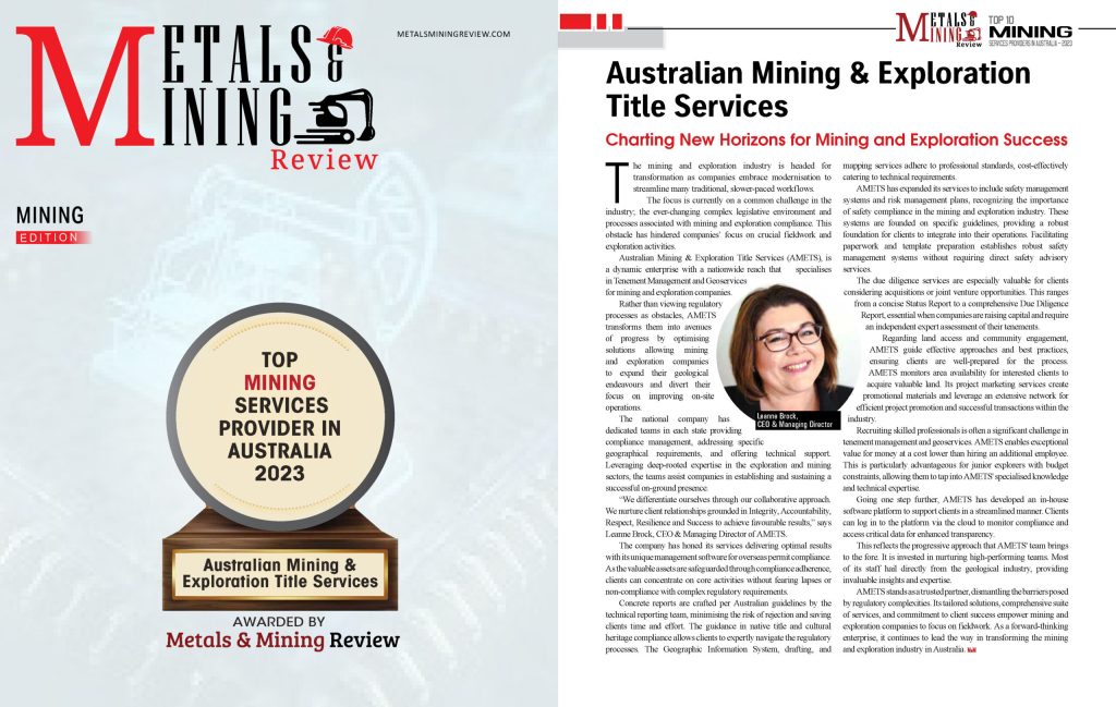 AMETS – Australian Mining & Exploration Title Services has been recognised as one of the Top Mining Services Providers in Australia by Metals Mining Review.