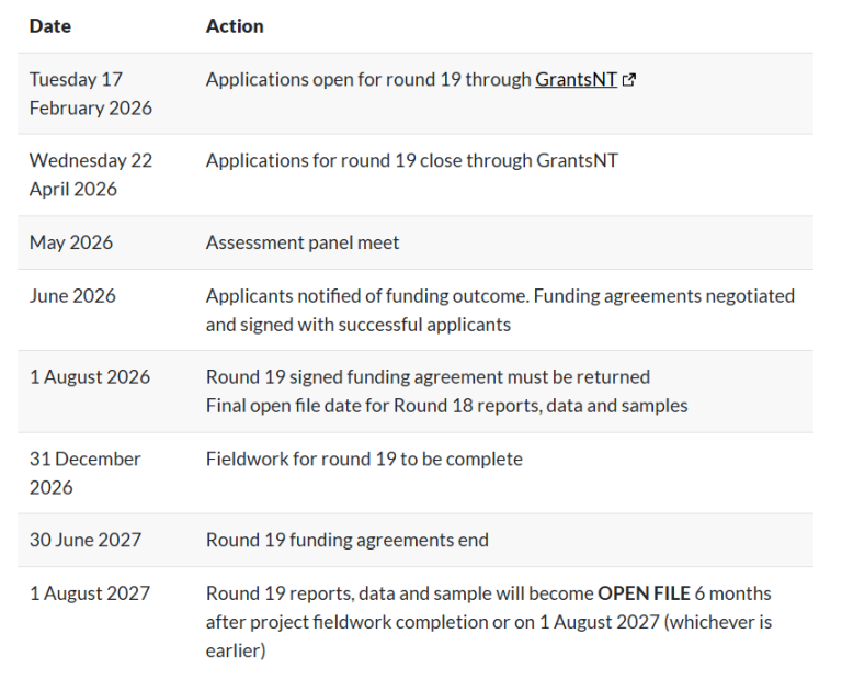 Funding is awarded on a competitive basis to co-fund eligible geophysics and drilling projects that address key geoscientific knowledge gaps, stimulate exploration activity, and support the discovery and development of resources in the Northern Territory. Applicants must meet the program’s eligibility requirements to be considered for funding.
