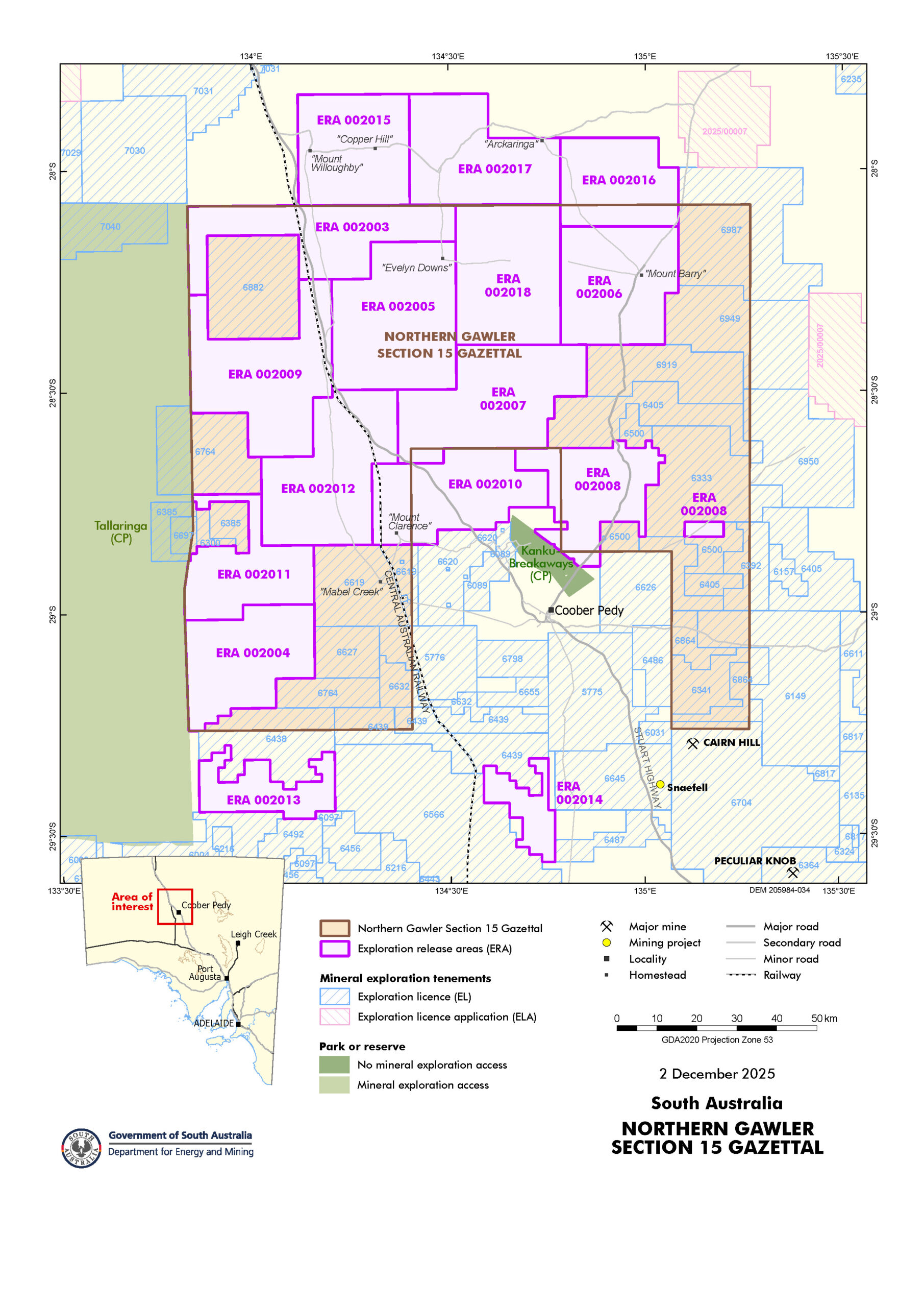 The Geological Survey of South Australia (GSSA) and the Department for Energy and Mining have confirmed that 16 co-located release areas will be made available through a competitive tender process. This province-scale opportunity is expected to draw strong interest from explorers targeting copper, critical minerals, and other strategically important commodities.