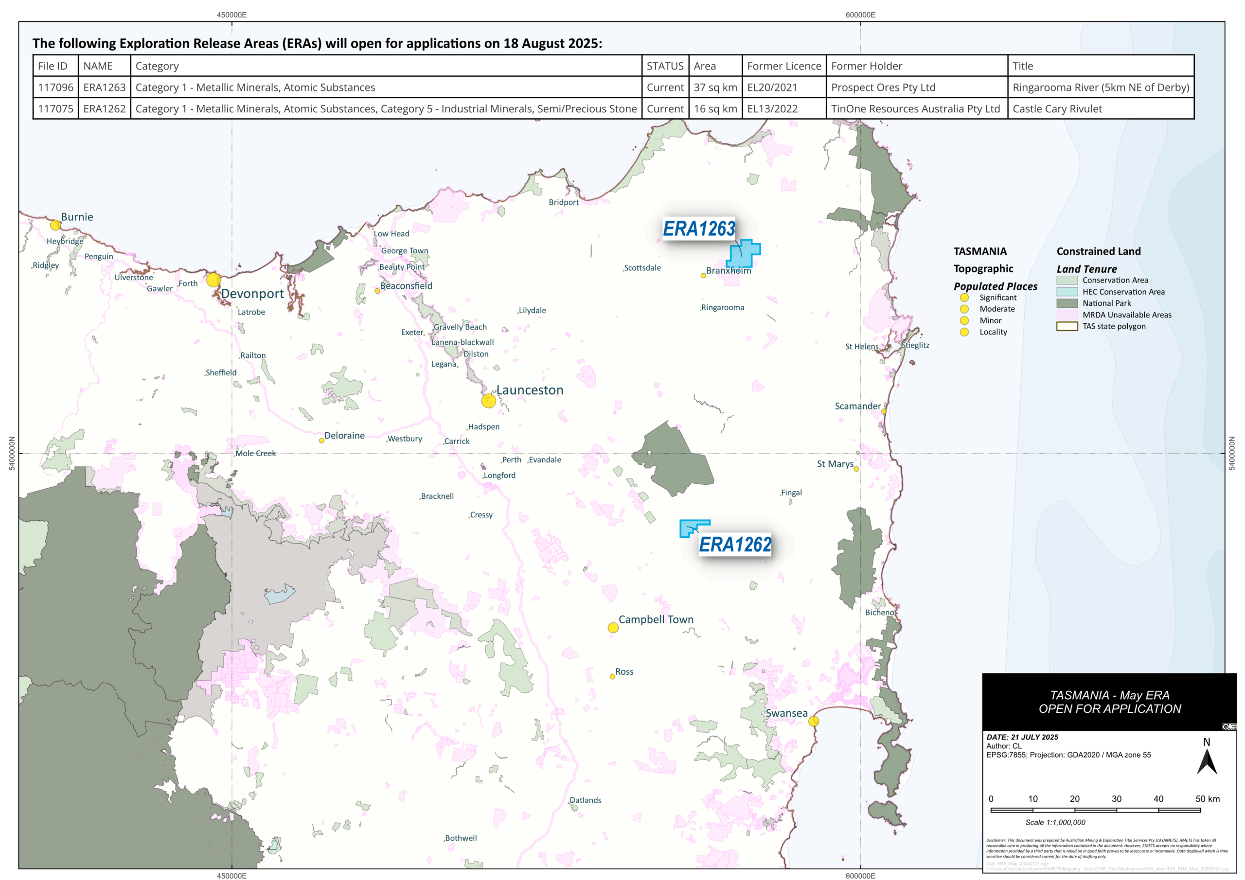 | ERA1263 | Ringarooma River | EL20/2021 | Prospect Ores Pty Ltd |