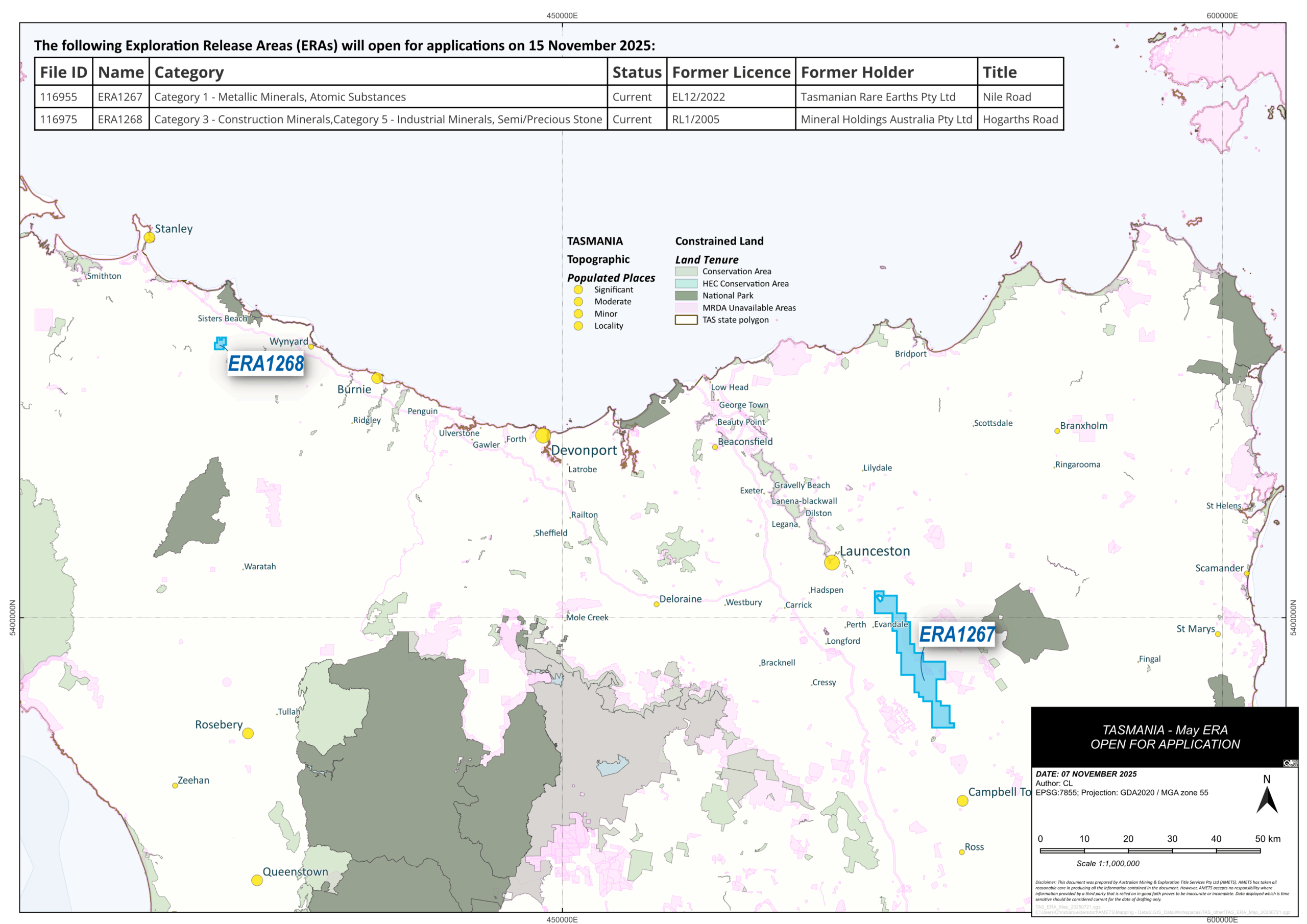 | ERA1267 | Nile Road | EL12/2022 | Tasmanian Rare Earths Pty Ltd |